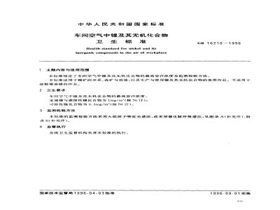 本标准规定了车间空气中镍及其无机化合物的最高容许浓度及监测检验方法。本标准适用于镍矿的开采、选矿与冶炼,以及生产与使用镍及其无机化合物的各类作业。不适用于接触羰基镍的作业。 GB 16210-1996 车间空气中镍及其无机化合物卫生标准 GB16210-1996 标准下载解压密码:www.bzxz.net
