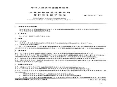 本标准规定了含放射性物质消费品对公众照射的剂量限制原则与放射卫生防护评价方法。本标准适用于含放射性物质消费品。 GB 16353-1996 含放射性物质消费品的放射卫生防护标准 GB16353-1996 标准下载解压密码:www.bzxz.net