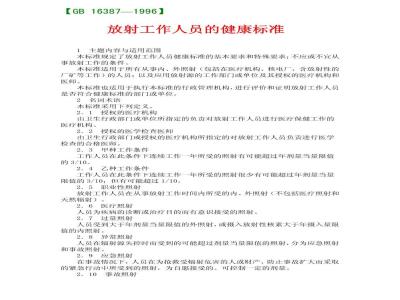 本标准规定了放射工作人员健康标准的基本要求和特殊要求;不应或不宜从事放射工作的条件。本标准适用于所有从事内、外照射的人员;以及应用放射源的工作部门或单位及其授权的医疗机构和医师。本标准也适用于执行本标准的行政管理机构,进行评价和证明放射工作人员是否符合健康标准的部门或单位。 GB 16387-1996 放射工作人员的健康标准 GB16387-1996 标准下载解压密码:www.bzxz.net