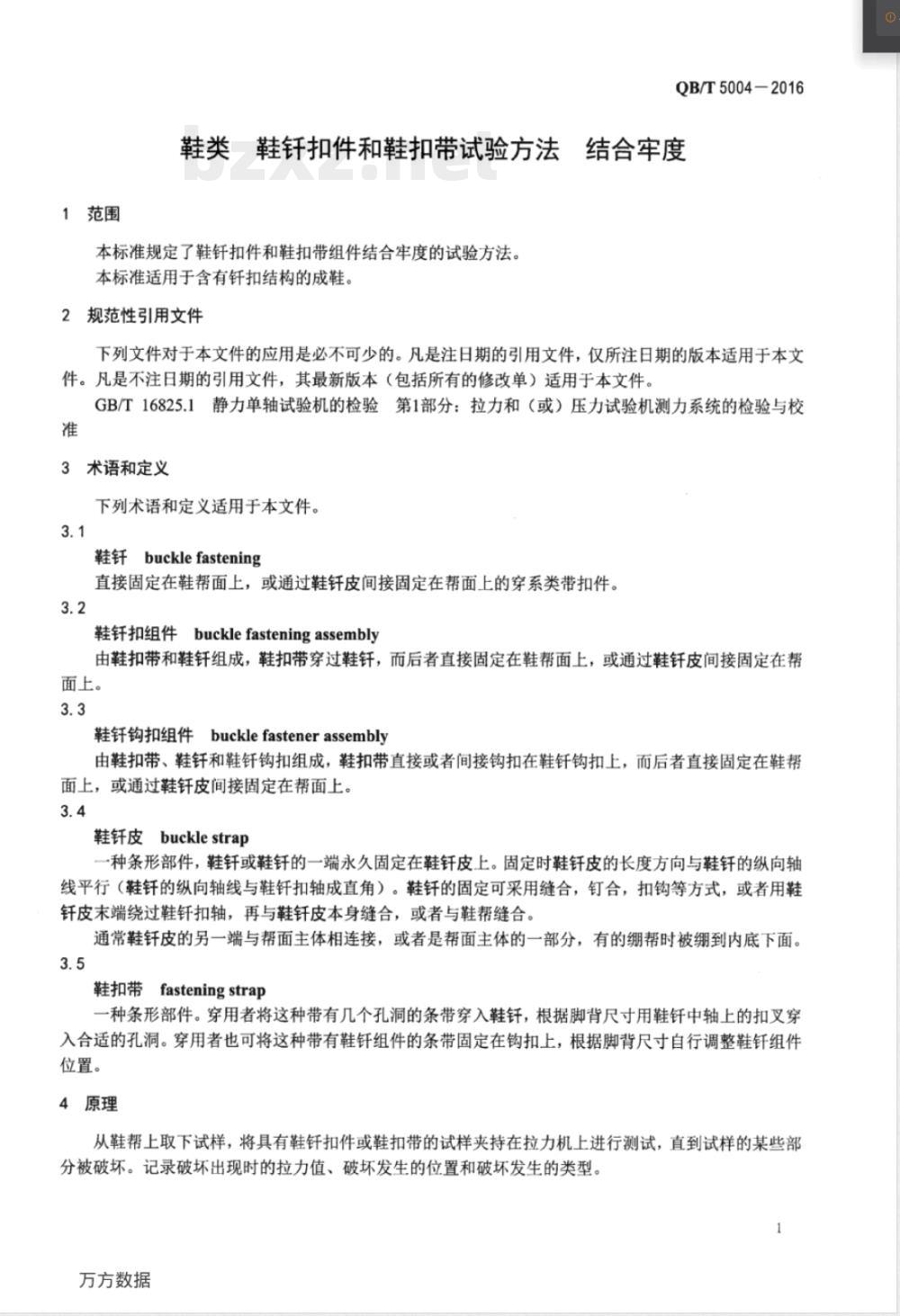 鞋类鞋钎扣件和鞋扣带试验方法结合牢度本标准规定了鞋钎扣件和鞋扣带组件结合牢度的试验方法。本标准适用于含有钎扣结构的成鞋。2规范性引用文件