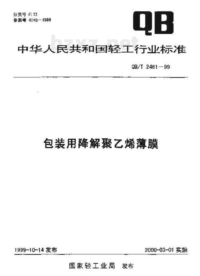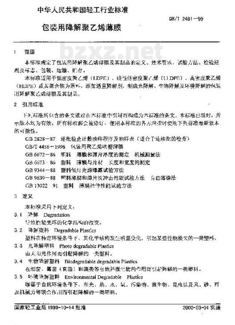QB/T 2461适用于低密度聚乙烯(LDPE)、线性低密度聚乙烯((LLDPE)、高密度聚乙烯(HDPE)或其混合物为原料,添加适量降解剂,制成光降解、生物降解及环境降解的包装用降解聚乙烯薄膜及其制品。
