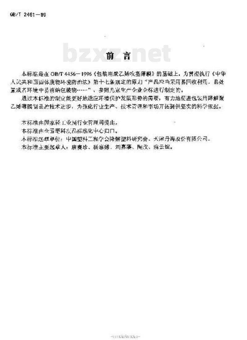 本标游是在G日4456一19966包装用暴乙烯吹驾薄赔的基础上,为期衡热行6中华人民共和国面体度物环竞防法第十七东现定的原门产品应当采用易四收利用,易处置或有环境中消纳包装物..”,孝瓶凡家生产企业企标进行制定拍。通过本标准的制定能更好地适应环境保护发展形势的需要,有力地低进包装用降解乙塔薄膜例弱的技术造步,为强化行业生产、技术管课和市场开拓提供坚实的科学依指。本标准市围家轻业局行业节理司提。本标准皮会至帮料标端化中心归口。本标消冠草单位:中国塑料二程学会降解塑料研究会、大津海投份有限公司.去标准土费起草人:唐赛修、桥出娣,刘嘉蒸、陶次、翁云。yrkaNnrkea