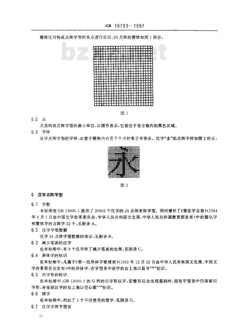 GB16793-—1997依据GB13000.1的基本多文种平面中1区所提供的汉字字符,以我国规范字形为基础并按照整理汉字字形的原则,具体地设计和规定了汉字信息系统用24点阵字型。GB16793—1997规定了GB13000.1中G列汉字的24点阵字型,若G列位置空缺字,则递补T、J、K列的汉字,并加外框线标识。本标准的附录 A和附录 B是标准的附录;附录 C和附录 D 是提示的附录。本标准由中华人民共和国电子工业部提出。本标准由电子工业部标准化研究所归口。本标准起草单位:电子工业部标准化研究所、第二炮兵第二研究所、电子部计算机与微电子发展研究中心。