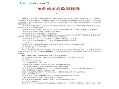 本标准规定了布鲁氏菌病疫情监测工作的内容和方法。本标准适用于各类布病疫区。 GB 16885-1997 布鲁氏菌病监测标准 GB16885-1997 标准下载解压密码:www.bzxz.net
