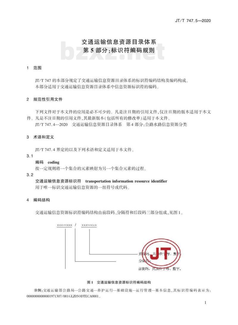 JT/T 747.5-2020 Transportation information resource catalog system-Part 5:Coding rule of identifier.