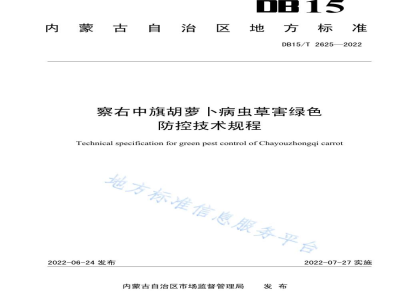 内蒙古自治区地方标准DB15/T2625-2022《察右中旗胡萝卜病虫草害绿色防控技术规程》,规定了胡萝卜生产过程中病虫草害绿色防控原则与主要措施,适用于察右中旗胡萝卜种植的标准化绿色防控管理。
