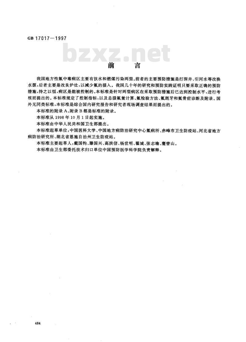 我国地方性氟中毒病区主要有饮水和燃煤污染两型。前者的主要预防措施是打深井、引河水等改换水源,后者主要是改良炉灶,以减少氟的摄入。我国几十年的研究和预防实践证明只要采取正确的预防措施,持之以恒,病区是能被控制的。本标准是针对两型病区在采取预防措施后已达到控制水平,进行考核而提出的。本标准规定了控制指标,以及总摄氟量计算、氟检验方法、氟斑牙和氟骨症诊断及附录。国外无同类标准,本标准是综合国内研究报告和研究者现场调查结果而提出的。本标准的附录 A、附录 B都是标准的附录。本标准从1998年10月1日起实施。本标准由中华人民共和国卫生部提出。本标准起草单位,中国医科大学、中国地方病防治研究中心氟病所、赤峰市卫生防疫站、河北省地方病防治研究所、湖北省恩施自治州卫生防疫站。本标准主要起草人:戴国钧、藤国兴、高洪信、杨世明、翟城、张志瑜、塞曾山。本标准由卫生部委托技术归口单位中国预防医学科学院负责解释。484
