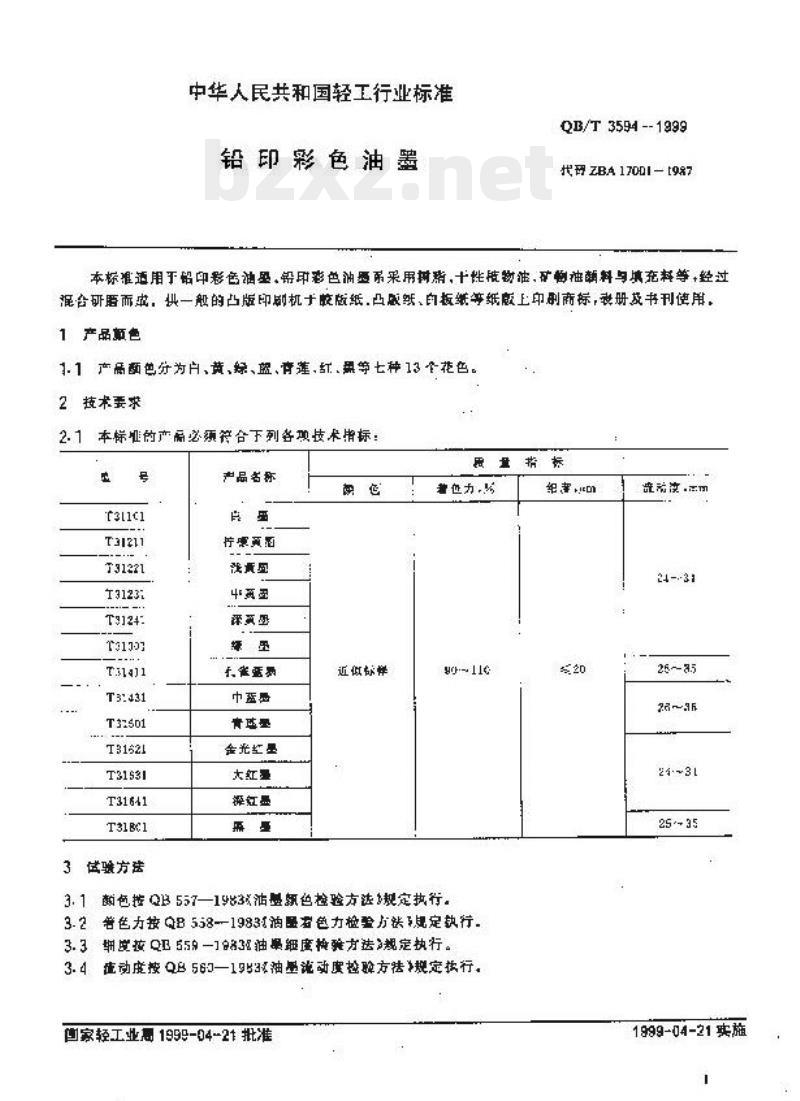 QB/T 3594适用于铅印彩色油墨。铅印彩色油墨系采用树脂、干性植物油、矿物油颜料与填充料等,经过混合研磨而成。供一般的凸版印刷机于胶版纸,凸版纸、白板纸等纸版上印刷商标,表册及书刊使用。1产品颇色