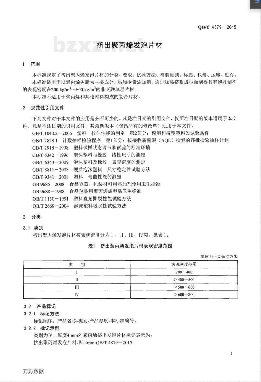 本标准规定了挤出聚丙烯发泡片材的分类、要求、试验方法、检验规则、标志、包装、运输、贮存。本标准适用于以聚丙烯树脂为主要成分,添加少量添加剂,通过加热挤塑成型而制得具有泡孔结构的表观密度在200kg/m2~800kg/m2的非交联单层片材。本标准不适用于聚丙烯和其他材料构成的复合片材。2规范性引用文件