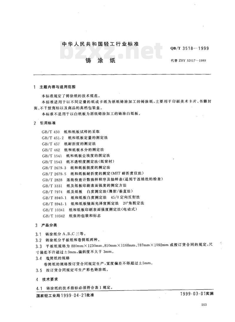 QB/T 3518适用于以不同定量的纸或卡纸为原纸铸涂加工的铸涂纸,主要用于印刷美术卡.片、书籍封面,不干胶商标以及商品的高档包装盒。