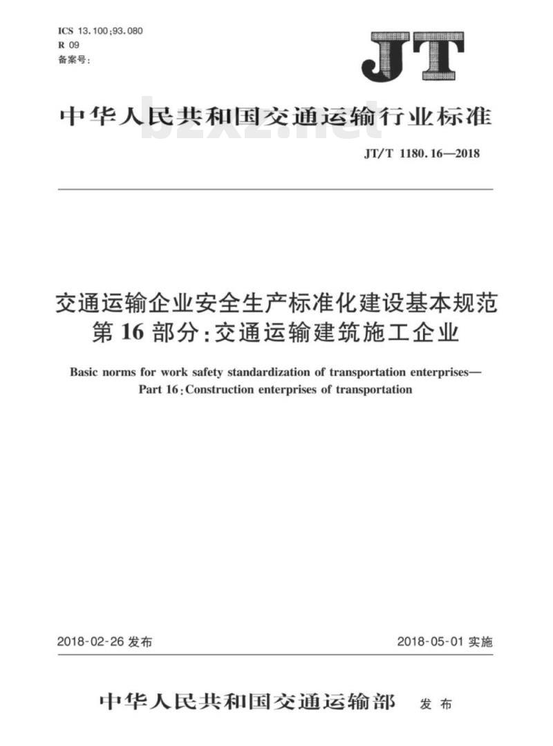 交通运输企业安全生产标准化建设基本规范第16部分:交通运输建筑施工企业Basic norms for work safety standardization of transportation enterprises-Part16:Constructionenterprisesoftransportation2018-02-26发布