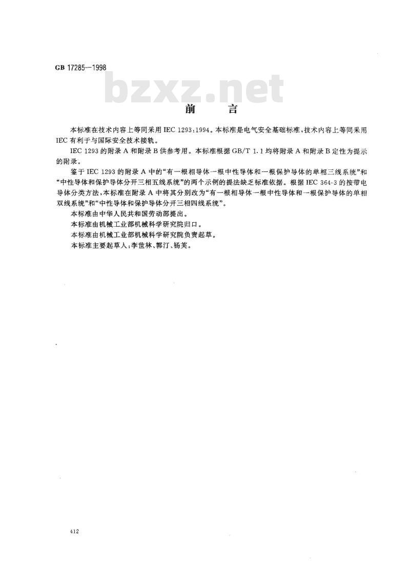 鉴于IEC1293的附录A中的“有一根相导体一根中性导体和一根保护导体的单相三线系统”和“中性导体和保护导体分开三相五线系统”的两个示例的提法缺乏标准依据。根据IEC364-3的按带电导体分类方法,本标准在附录A中将其分别改为“有一根相导体一根中性导体和一根保护导体的单相双线系统”和“中性导体和保护导体分开三相四线系统”。本标准由中华人民共和国劳动部提出。本标准由机械工业部机械科学研究院归口。本标准由机械工业部机械科学研究院负责起草。本标准主要起草人:李世林、郭汀、杨芙。412
