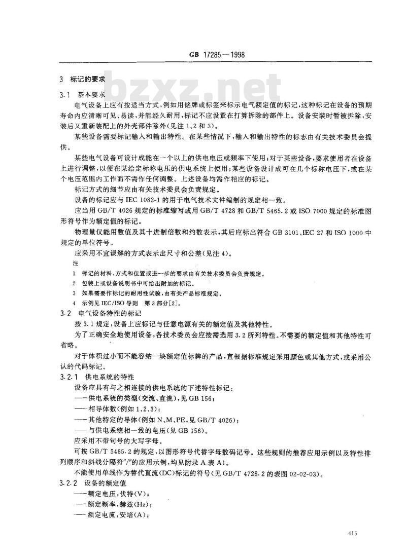 1标记的材料、方式和位置或进一步的要求由有关技术委员会负责规定。2包装上或设备说明书中可给出附加的标记。3如果需要作标记的耐用性试验,由有关产品标准规定。4示例见IEC/ISO导则第3部分[2]。3.2电气设备特性的标记
