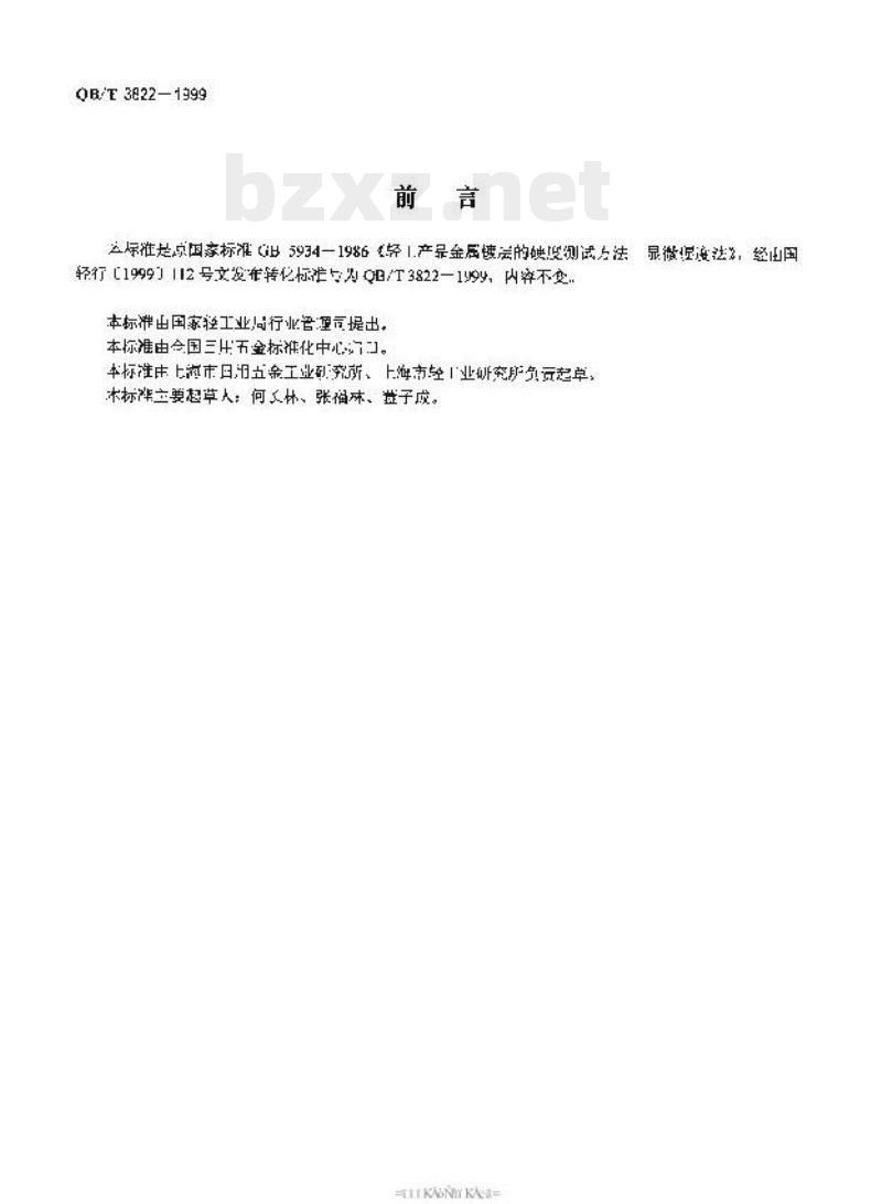 立标准龙京国标准GH5934一1986《轻1.产异金居镀层的碘度测试力法显微保法\,经出国轻行(1999】112号文发准转化标法专为QB/T3822—1099,内案不变,本标准出国家轻工业局行业咨望司提出,本标准由会国三出五金标准化中心门司。本标准审上海市回立余工业列引弃所、上海市轻1业研究所负贡起草,木标萍立要起草人:何又林、张福殊、进子成。tfKAoNnYKAca=