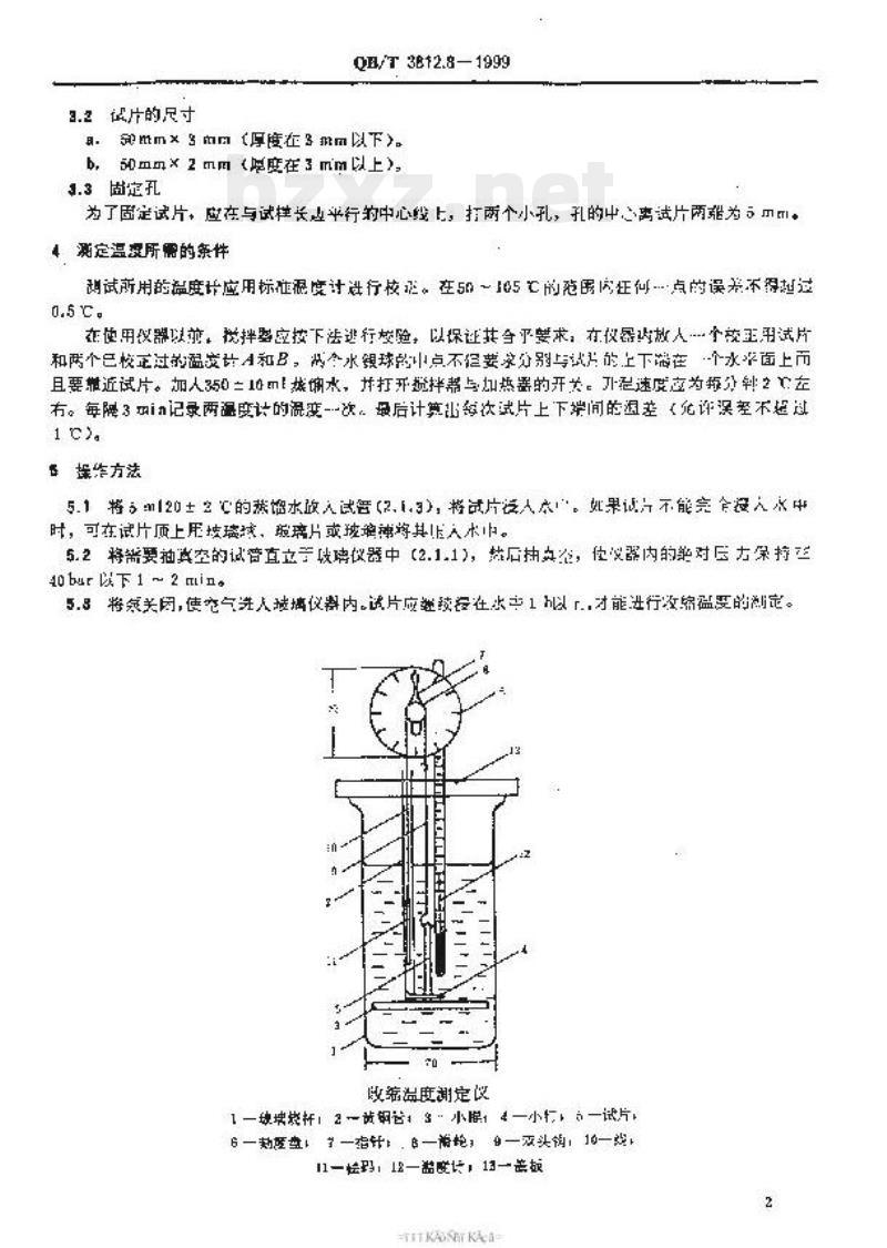 5.B每需30:记录一次退度和相应的指针的试欲,直到试片明量地收缩载水强效滞膜为止。如果到沸腰才收密,记录沸群时水的温度(见4条)。查阅记录数据所列出的表或分析指计试数与相应温度所形成的曲线阅,找出试片在最大长度时的指时位置向收缩方的移动半分度时的温度。记录这个温度推为试片(6.3)的收缩温度。5.如果按上法测得的收编温度,不过切人时的水满5,所待的结果应弃去,并技,1到5,3条的规定另行润温试片,按5.4一5,的操作直新定,6据作注意享项