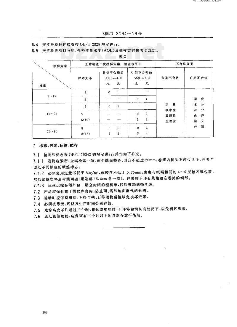 7.1.2必须使用定量不低于80g/m2,施胶度不低于0.75mm,宽度与纸幅相同的4~6层包装纸包装,然后加捆塑料扁带绕两道(距端部15.0cm各一道)。包装时不许有浆糊落在卷筒简的端部。7.1.3远途运输必须外包一层全封闭的塑料布,然后缠绕满幅草绳。7.2产品应保管在干燥的库房内,防止雨、雪和地面湿气的影响。7.3运输时应保持清洁,不得与铁、石等硬物碰撞以免损坏纸张。7.4必须按等级、规格及生产时间分别存放。7.5堆垛高度不许超过三个辊,搬运或堆垛时,不许将卷简从高处扔下,以免损坏纸张。7.6原纸在使用前,应保证有三个月以上的自然存放平衡期。386