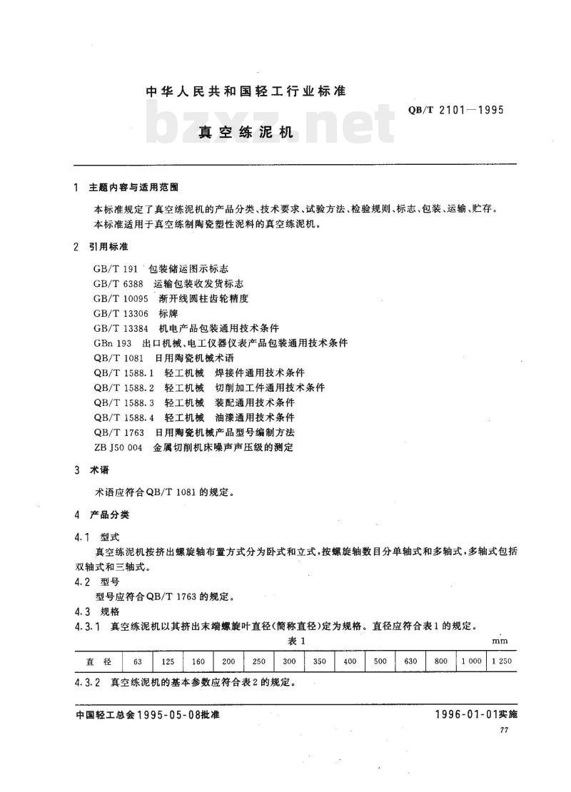 4.3.1真空练泥机以其挤出末端螺旋叶直径(简称直径)定为规格。直径应符合表1的规定。