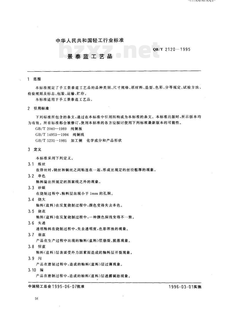 QB/T 2120规定了手工景泰蓝工艺品的品种类别、尺寸规格、原材料、造型、色彩、分等规定﹑试验方法、检验规则及标志,包装,运输、贮存。
