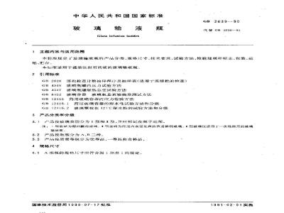 本标准规定「玻璃输液瓶的产品分类、规格尺寸,技术要求、试验方法,检验规则和标志、包装、运输、忙存