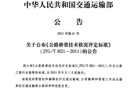 现公布《公路桥梁技术状况评定标准》(JTG/TH21—2011),作为公路工程行业推荐性标准,自2011年9月1日起施行。该规范的管理权和解释权归交通运输部,日常解释和管理工作由主编单位交通运输部公路科学研究院负责。请各有关单位在实践中注意总结经验,及时将发现的问题和修改建议函告交通运输部公路科学研究院(地址:北京市海淀区西土城路8号,邮政编码:100088),以便修订时参考。特此公告。