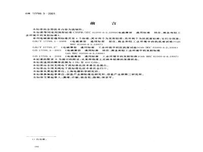 GB17799.42001《电磁兼容通用标准工业环境中的发射标准》(idtIEC61000-6-41997)本标准的附录A为提示的附录,从某种程度上反映本标准的发展状态。本标准适用的频率范围为0Hz至400GHz。本标准由全国无线电干扰标准化技术委员会提出。本标准由全国无线电干扰标准化技术委员会归口。本标准负责起草单位:上海电器科学研究所。本标准参加起草单位:信息产业部标准化研究所、信息产业部第三研究所。本标准主要起草人:龚增,许毅,杨自佑,陈俐,林京平。1)待出版。