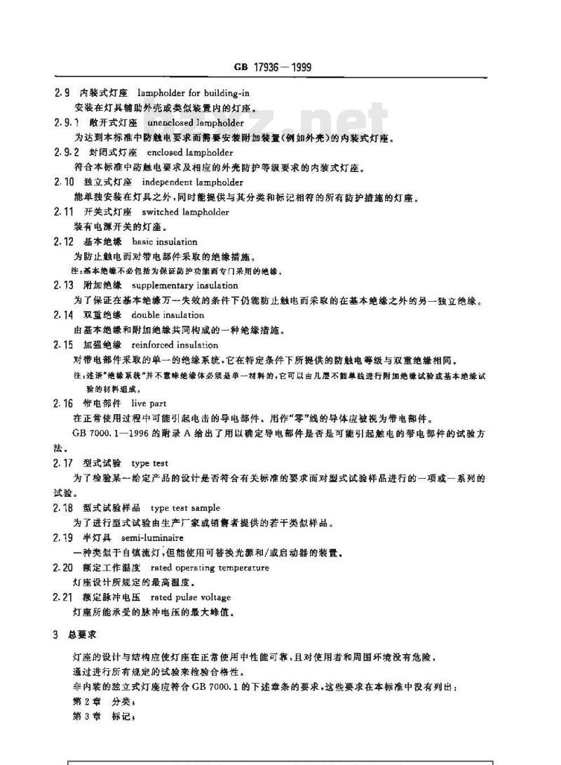 本标准适用于将灯泡和半灯具连接到额定电压为250V电源电压上的B15d和B22d卡口灯座。本标准还适用于那些与灯具完全或部分结为一体的灯座,或按规定要安装在设备之内的灯座。不是专门用于嵌装的独立式灯座,例如平装式灯座,还要采用第3章所述的附加要求。注:在灯具中使用的灯座的最高工作温度在GB 7000.1中给出。B15、B22代表由GB 1407和QB 3588型式与尺寸及相应量规所决定的灯头/灯座配合系统。 GB 17936-1999 卡口灯座 GB17936-1999 标准下载解压密码:www.bzxz.net