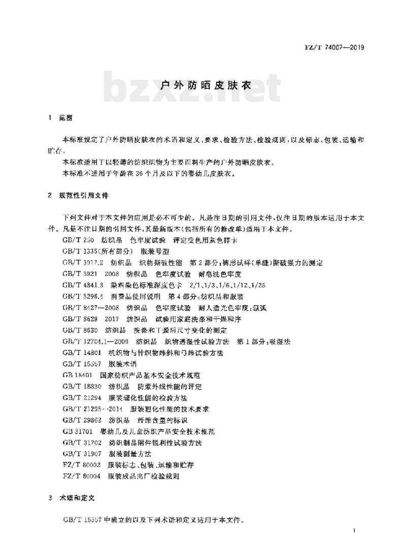 FZ/T 74007规定了户外防晒皮肤衣的术所和定义.要求.检验方法.检验规则,以及标虑、包装.运输和贮谷。