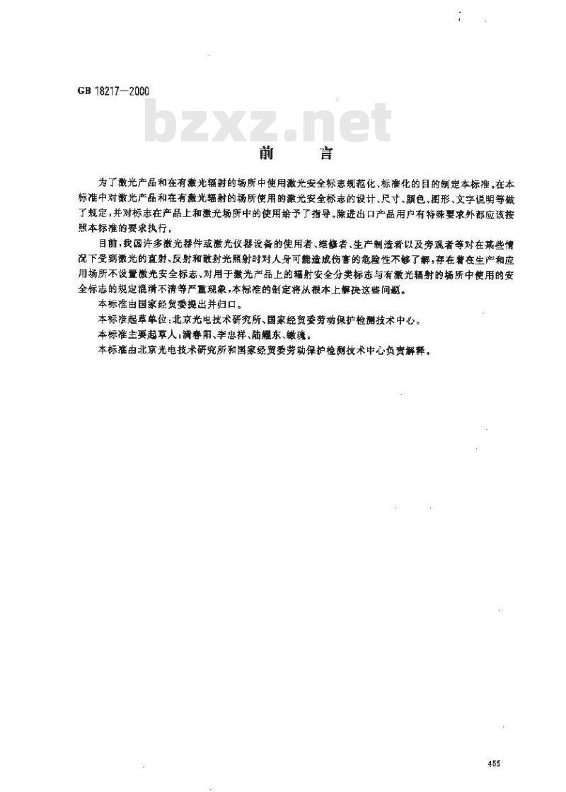目前,我国许多激光器件或激光仪器设备的使用者、维静者、生产制造者以及旁观者等对在莱些情况下受到邀激光的真射、反射和散射光照射时对人身可能造虑伤害的危险性不够了解,存在誉在生产和应用场所不设置微光安全标志,对用于激光产品上的辐射安全分类标志与有激光辐射的场所中快用的安全标志的规定混清不清等严重现象,本标准的制定将从根本上解决这些间题。本标准由国家经贸委提出并归口。本标准起草单位;北京光电技术研究所、国家经资委劳动保护检测技术中心。本标准主要起草人,满春阳、李忠祥、陆耀东,缴珑。本标准由北京光电技术研究所和国家经贸委劳动保护检测技术中心负责解释。455