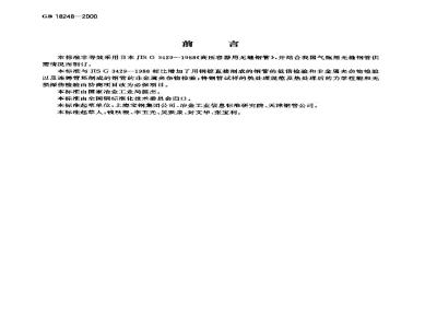 本标准与JISG3429—1988相比增加了用钢锭直接制戒的钢管的低倍检验和非金属夹杂物检验以及连铸管坏制成的钢管的非金属夹杂物检验;将钢管试样的热处理规范及热处理后的力学性能和无损探伤检验由协商项目改为必保项目。本标准由国家冶金工业局提出。本标准由全国钢标准化技术委员会归口。本标准起草单位:上海宝钢集团公司、冶金工业信息标准研究院、天津钢管公司。本标起草人:钱秋根、李玉光、吴跃泉、封文华、张宝利1范围