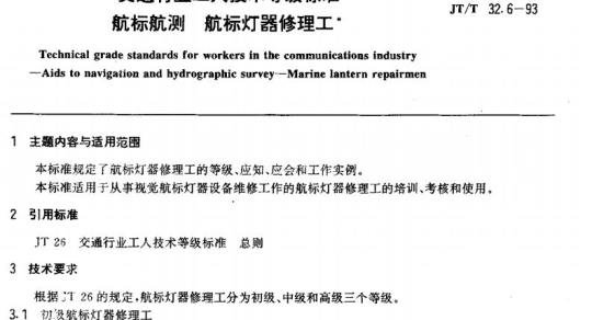 JT/T 32.6适用于从事视觉航标灯器设备维修工作的航标灯器修理工的培训、考核和使用。
