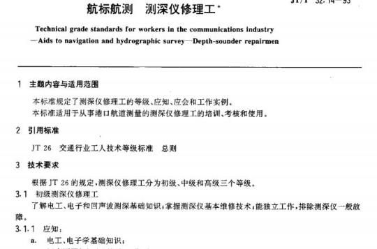 JT/T 32.14适用于从事港口航道测量的测深仪修理工的培训.考核和使用。