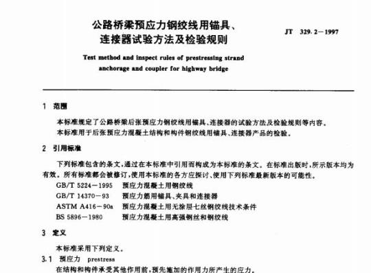 JT 329.2规定了公路桥梁后张预应力钢绞线用锚具、连接器的试验方法及检验规则等内容。