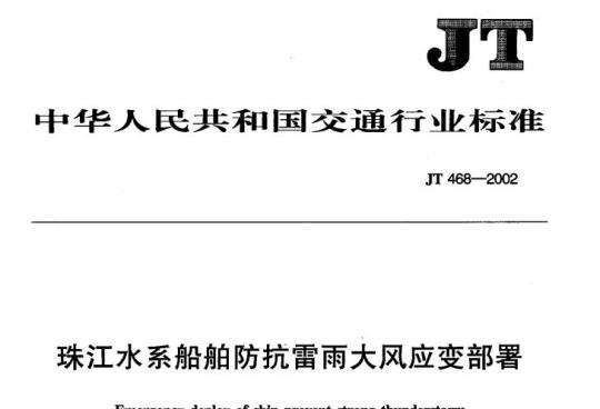 JT 468规定了珠江水系内河客船(包括旅游船商速客船)、货船(包括集装箱船、危险品运输船舶)、小型客渡船防抗雷雨大风应变部署,包括对船舶单位、船舶和船员的要求、船舶防抗雷雨大风演习要求、防抗雷雨大风应变措施、防抗操作程序等。