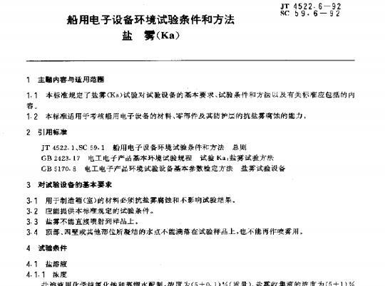 1.2 JT 4522.6适用于考核船用电子做备的材料、寄邢件及其防护层的抗盐雾腐蚀的能力.