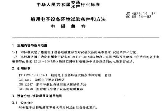 ,1本标准规定了船用电子设备电磁兼容性对达验没备的基本要求.试验条件和大法。1,2 本标准适用下弱定船用电平设备-在 50 Ha~30 MHz 颗段内电源网络,及产胞线 上应达到的各类电磁兼容的要求,以 27~~530 MHz 频没范围幅射电磁均中设备应到的电磁兼空要求。2 引用标准