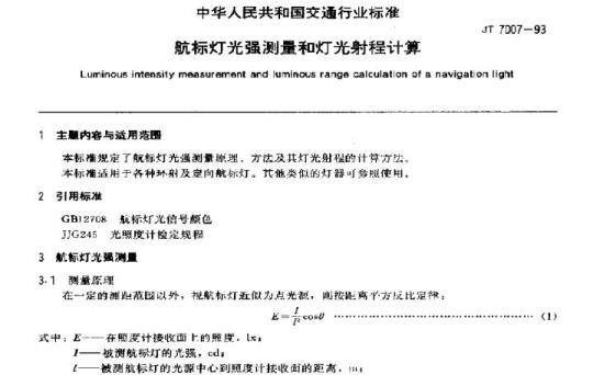 JT 7007规定了航标灯光强测量原理,方法及共灯光射程的计算力法。