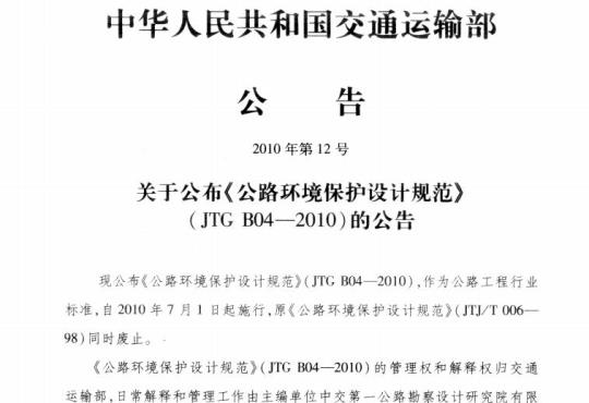 现公市《公路环境保护设计期范》BA4-2010)作为公路程行业标难,自2010年月1日起施行,原公路环境保护设计期密》TL00源98)同时废止。