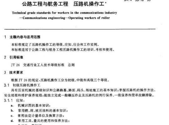 JT/T 33.18适用于公路工程与航务工程压路机操作工的培训、考核和使用。