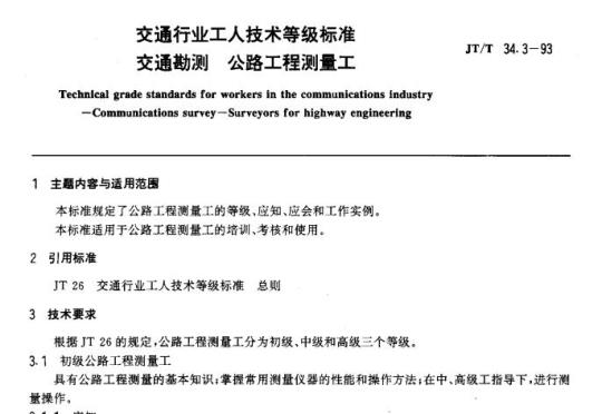 JT/T 34.3规定了公路工程测量工的等级、应知、应会和工作实例。