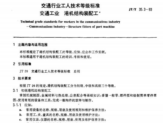 JT/T 35.3规定了港机结构装配工的等级、应知,应会和工作实例。