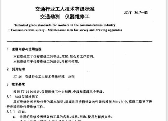 JT/T 34.7规定了仪器維修工的等级应知、应会和工作实例。