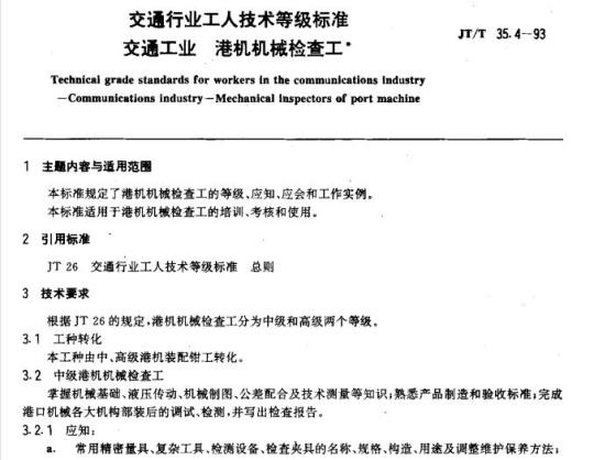 JT/T 35.4规定了港机机械检查工的等级、应知、应会和工作实例。
