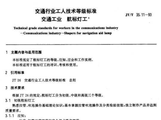 JT/T 35.11规定了航标灯工的等级、应知、应会和工作实例。