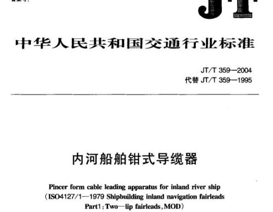 本标准代替T/T359—1995名内河船钳式导缆器》。本际准与.门I/T359—1995的主要变化按照GB/T【.1-2000进行编赶性修改本标准由全国内河书标准化技.术委员会(SA心IY:[30)提出并凸口:本标准起节单位:黑龙江水运规设计皖。本标准专加起单单位:交道部水运科学究所:本标准士要品草人:史祥卡冯峰邮济才乃意商惠店: