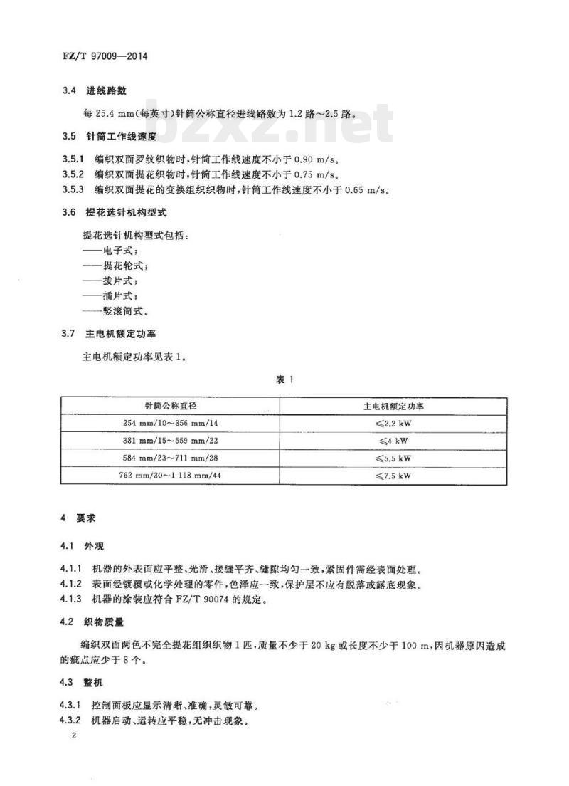 本标准按照GB/T1.1一2009给出的规则起草。本标准代替FZ/T97009—1992《纬编机双面提花圆型纬编机》。本标准与FZ/T97009—1992相比,主要差异如下:修改并增加了规范性引用文件(见第2章,1992年版的第2章);扩展了“针筒公称直径”的范围并增加了表格(见表1);—提高了“针简工作线速度”(见3.5,1992年版的3.3);提高了“织物质量”的要求(见4.2,1992年版的4.3.3;增加了“整机”要求,并将“噪声、温升、功耗”并入到“整机”要求中(见4.3);增加了“安全防护”的条款(见4.5);一提高了“针盘、针筒部件”的精度要求(见4.6,1992年版的4.11);更改了“编织三角”的硬度要求(见4.7,1992年版的4.12);FZ/T97009—2014