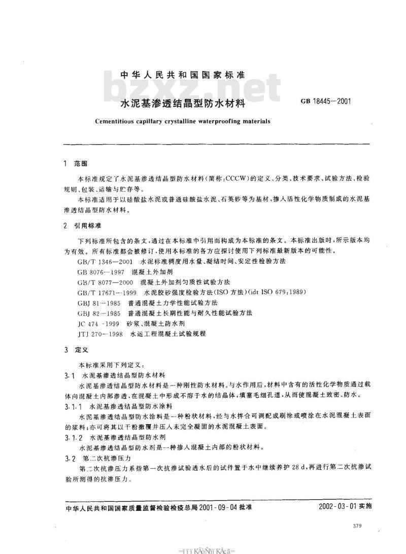 Cementitious capillary crystalline waterproofing materialsGB 18445--2001