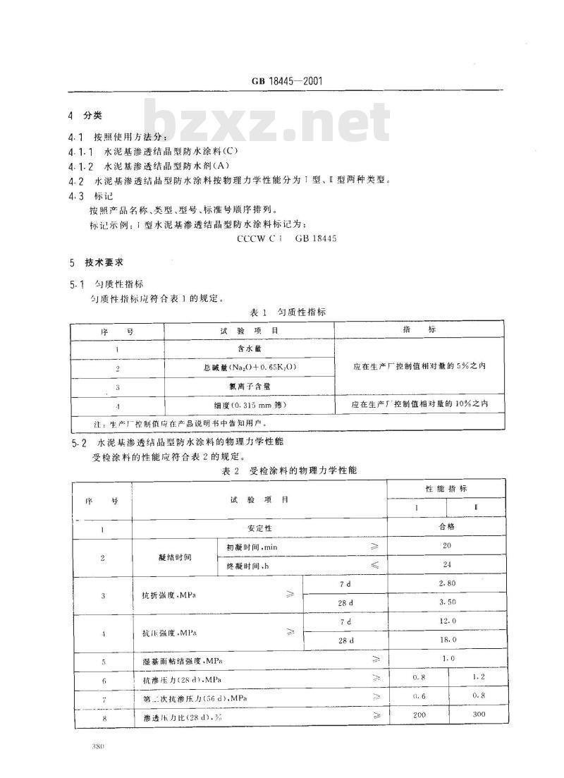 4.1.1水泥基渗透结晶型防水涂料(C)4.1.2水泥基渗透结晶型防水剂(A)GB 18445—2001