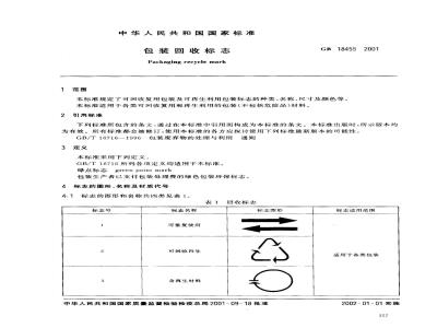 本标准规定了可回收复用包装及可再生利用包装标志的种类,名称、尺寸及颜色等。本标准适用于各类可间收复用和再生利用的包装(不包括危险品)材料。2引用标准