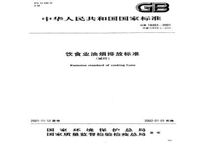 本标准规定了饮食业单位油烟的最高允许排放浓度和油烟净化设备的最低去除效率。本标准内容(包括实施时间)等同于2000年2月29日国家环境保护总局发布的《饮食业油烟排放标准》(试行)(GWPB5—-2000),自本标准实施之日起,代替GWPB5~—2000。本标准由国家环境保护总局负责解释。326