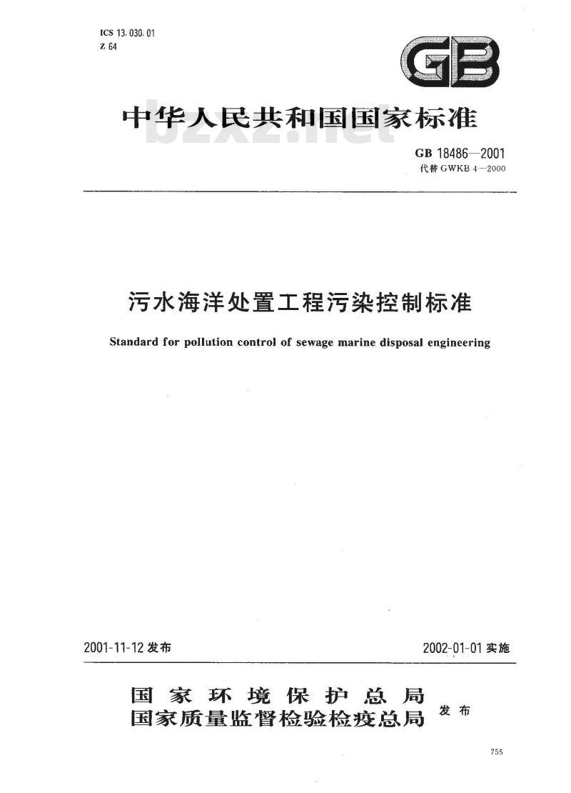 GB 18486-2001 污水海洋处置工程污染控制标准 GB18486-2001 标准下载解压密码:www.bzxz.net